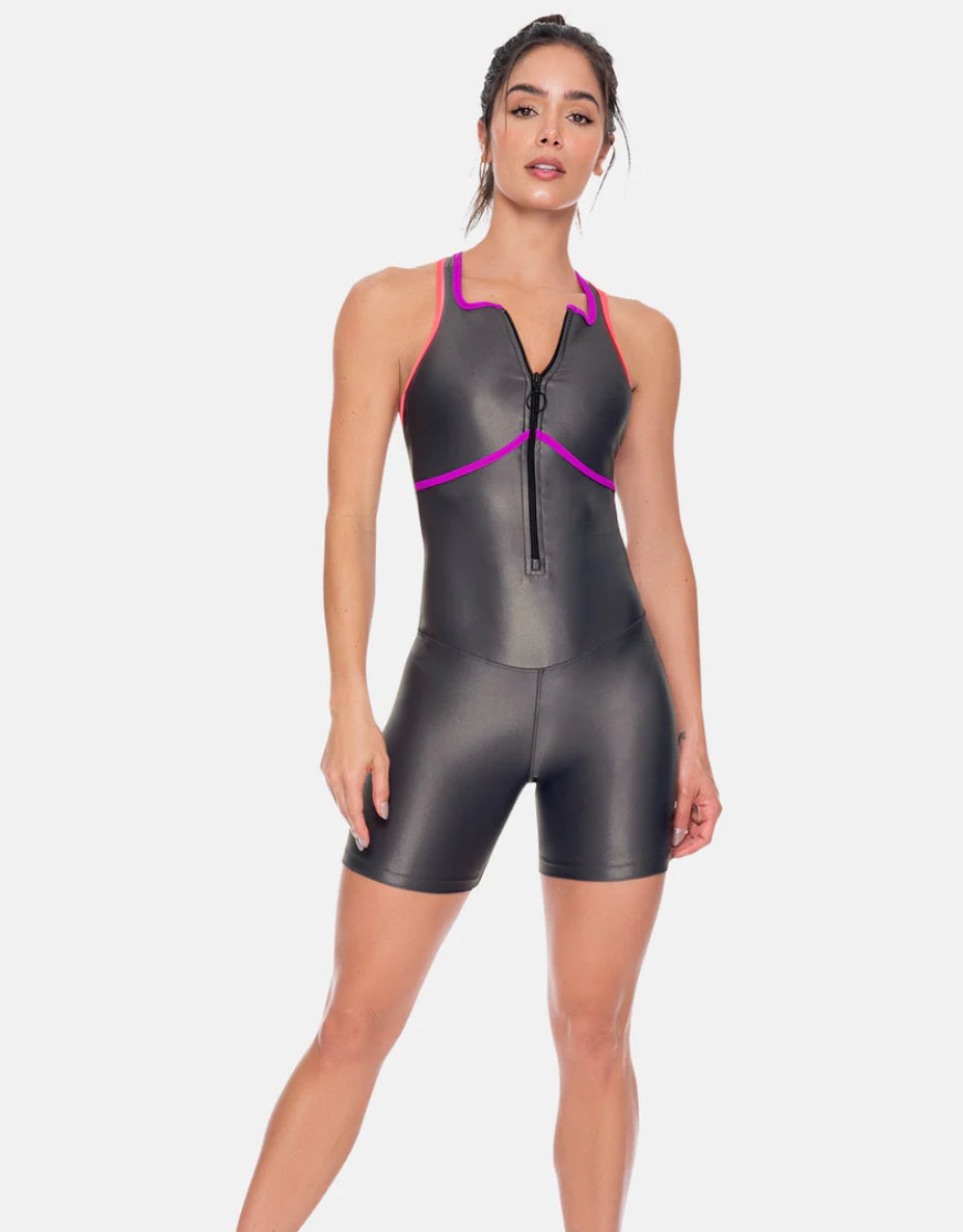 ENTERIZO DEPORTIVO CORTO MUJER CON APLIQUE PLASTICO, ELÁSTICO EXPUESTO, TELA APARIENCIA CUERO Y CIERRE FRONTAL