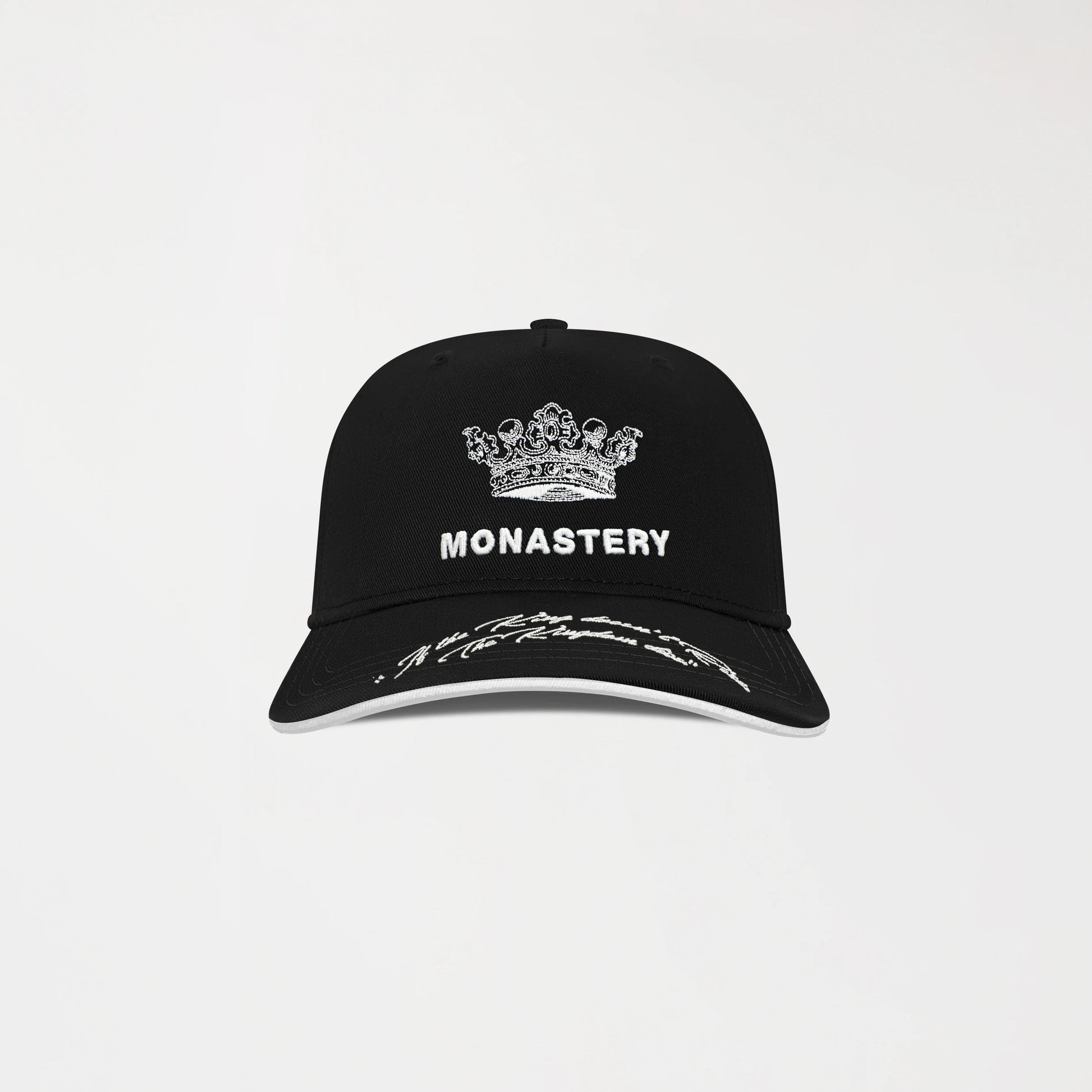 Gorra hecha de sarga de algodón con el monastery de texto bordado en hilo 3D en un tono contrastante, innovando en el diseño con arte de corona bordada plana. En su visera presenta la frase que define el propósito de nuestra colección. En el panel lateral, una placa metálica en tono ónix. En su parte trasera, un sistema de cierre tradicional en cuero bovino, esta pieza dará un toque final y mejorará todos tus looks, siendo perfecta para combinar con otras creaciones de la colección.