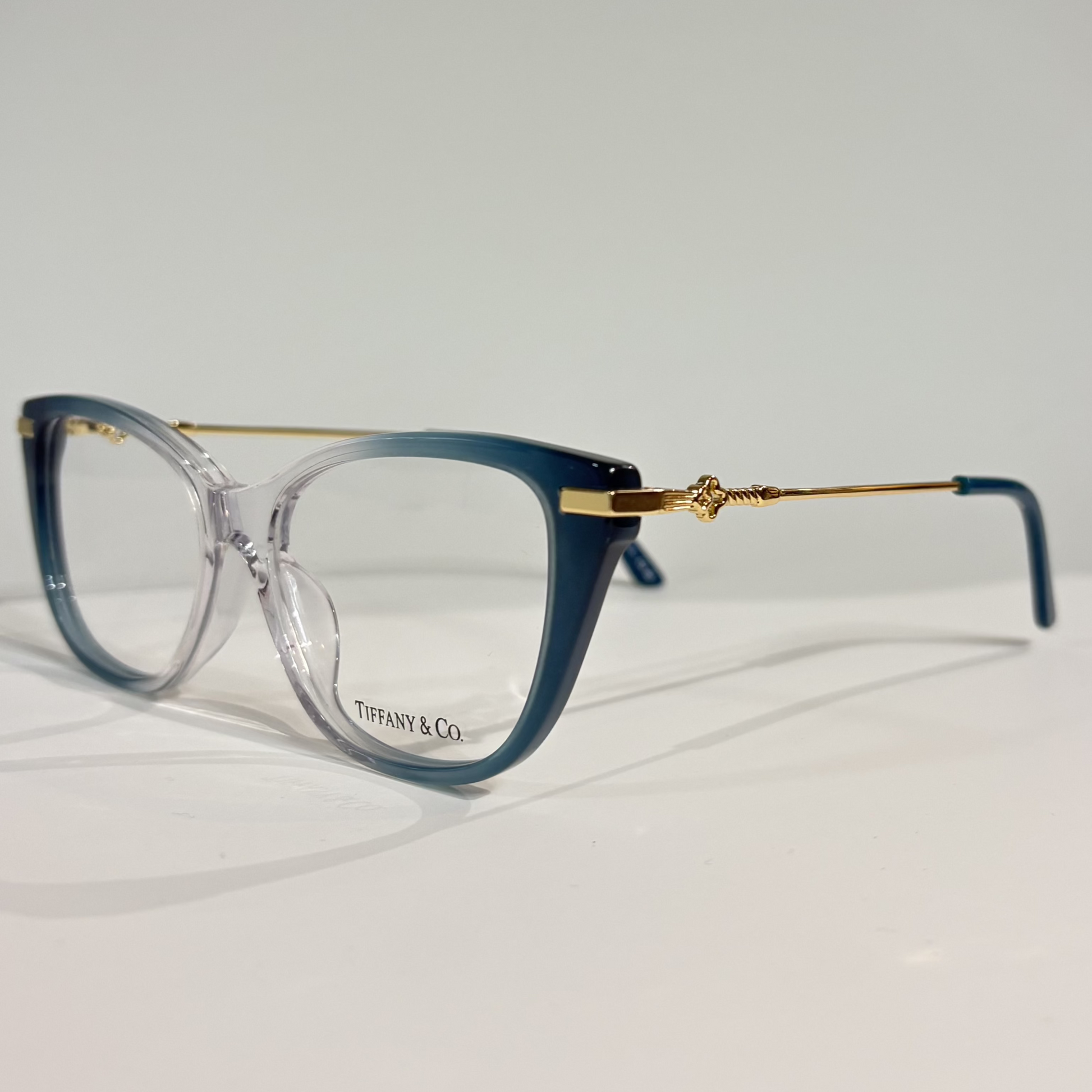 Gafas de mujer, color transparente y azul con detalles dorados