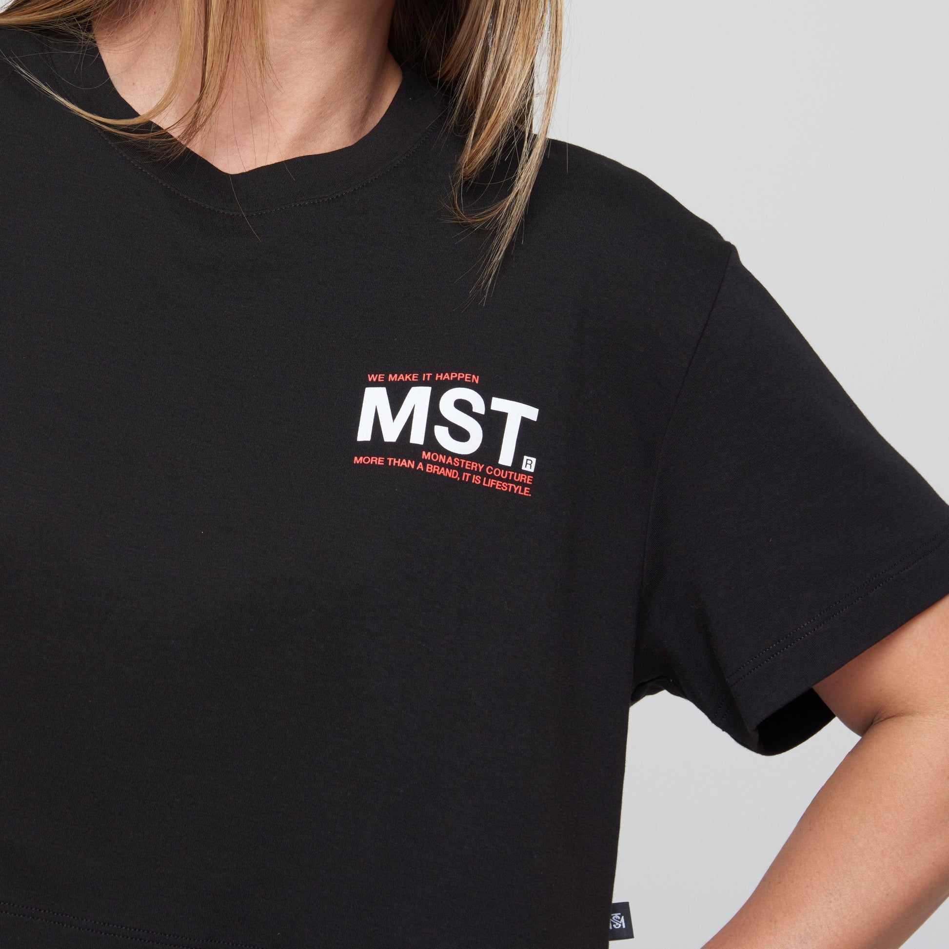 Camiseta tipo crop top Sohab, hecha en silueta de gran tamaño, lo que la convierte en una prenda clásica y versátil. Btextile, hecho de algodón 100% tipo entrelazado, estampado con detalles naranjas en la punta del corazón.