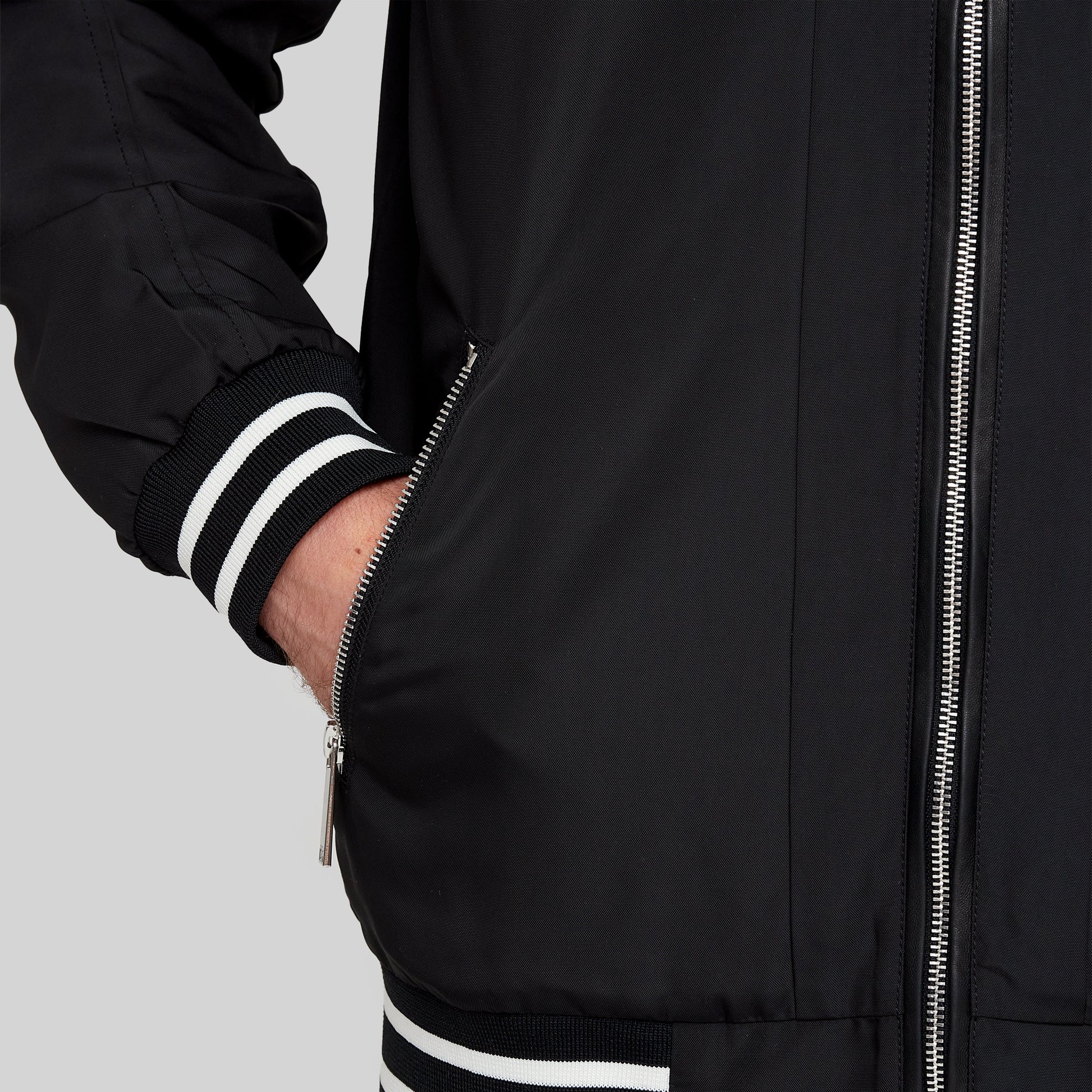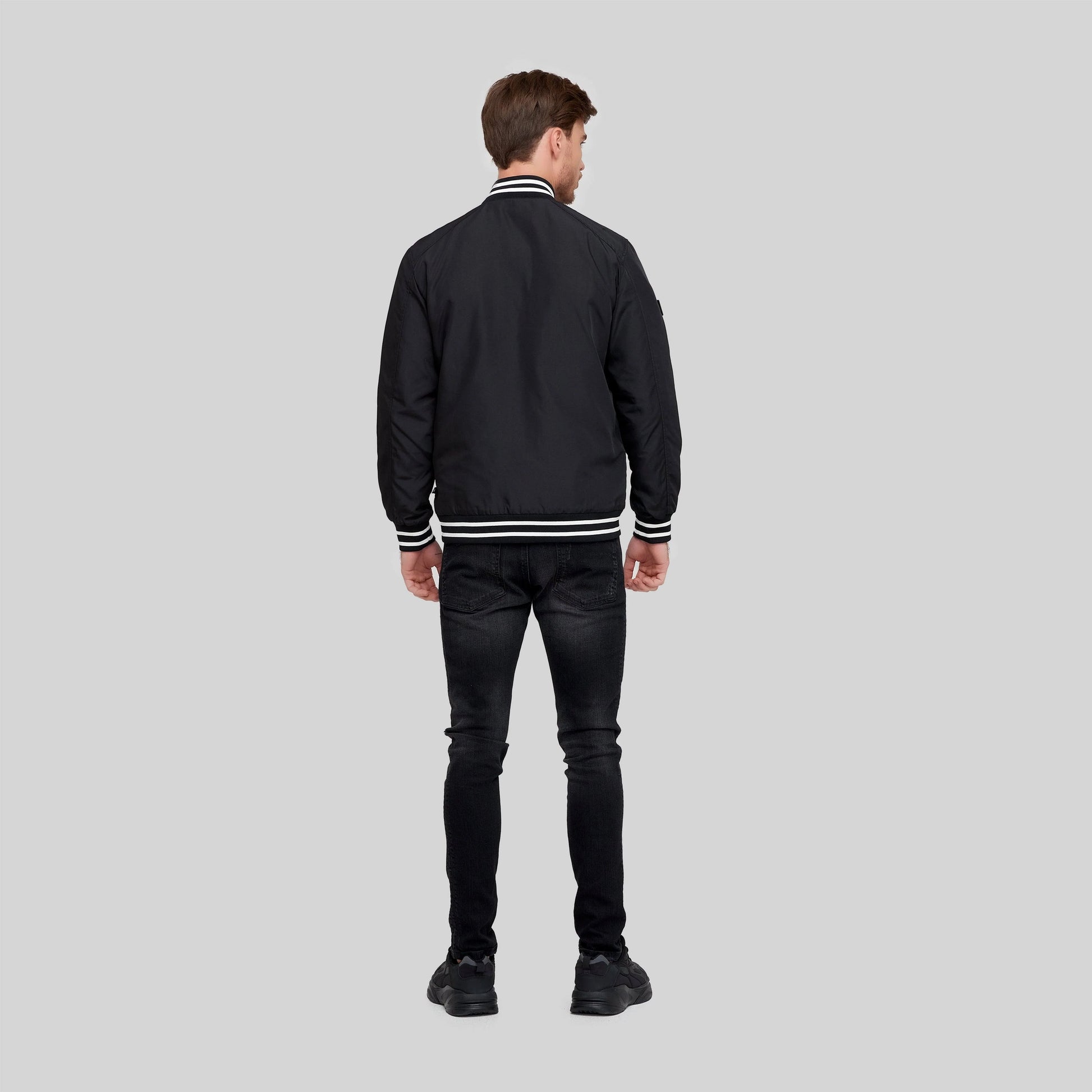 Chaqueta bomber con cuello, puños y fajon hecha de tela acanalada con líneas en contraste. Apliques contra-amargos en el punto del corazón en la manga izquierda. Presenta una silueta masculina regular, que ofrece un estilo moderno y distintivo.